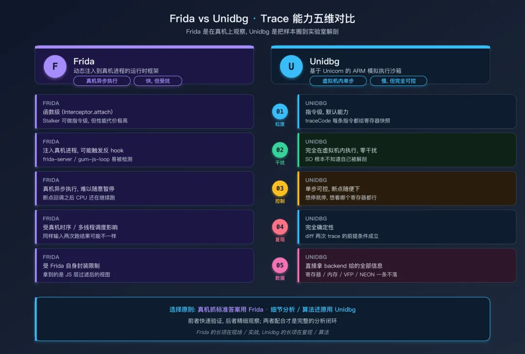 简单说:Frida 是“在真机上观察”,Unidbg 是“把样本搬到实验室解剖”。前者快,后者细。