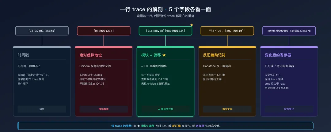 学会读这几列之后,整份 trace 就是一本“程序自述”:什么时候读了哪块内存、比较了什么、分支走了哪一条、返回值填到哪个寄存器,全都写得清清楚楚。
