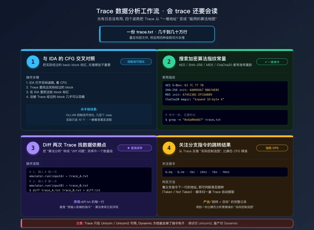 最佳工作流因此分成两段:分析阶段用 Unicorn2 + 全量 Trace,把算法、执行流、关键地址都摸清楚,把对照表做出来;量产阶段切到 Dynarmic,不开 Trace,只保留业务所需的 Hook。这样既能吃到分析期的可观察性,又能在部署时拿到 10 倍的吞吐。第三篇讲后端选型的时候我们就提过这事,这里在 Trace 语境下再强调一遍:可观察性从来不是白嫖,每一条 Trace 日志背后都是真金白银换来的 CPU 周期。
