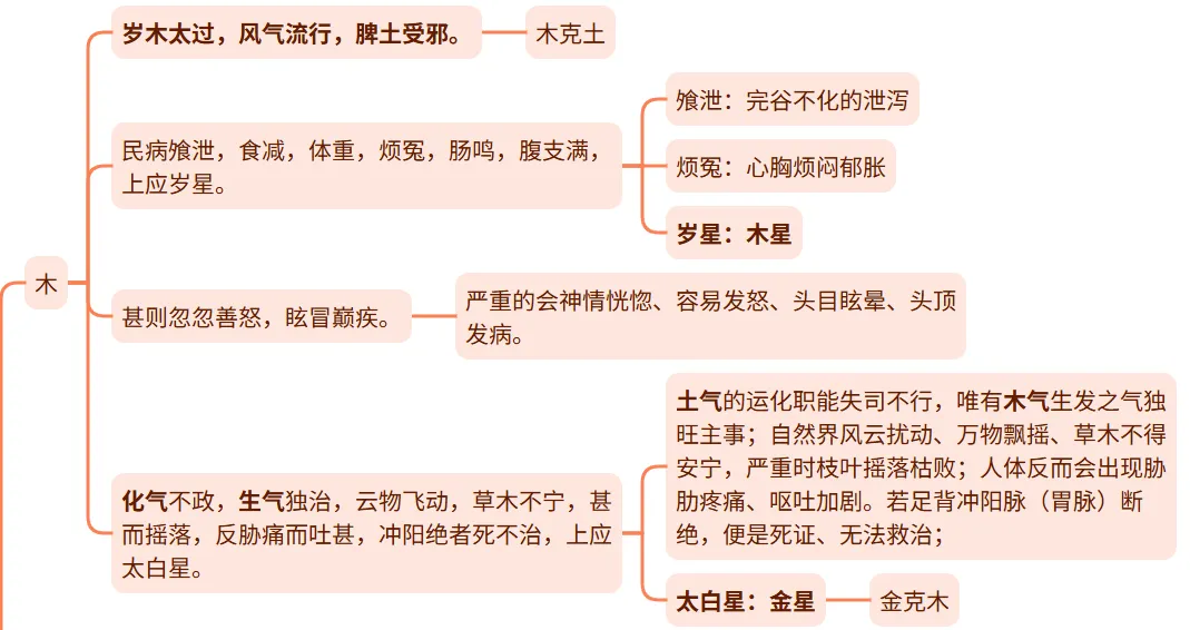 民病飧泄霍乱,体重腹痛,筋骨繇复,肌肉瞤酸,善怒,藏气举事,蛰虫早附,咸病寒中,上应岁星、镇星,其谷黅。