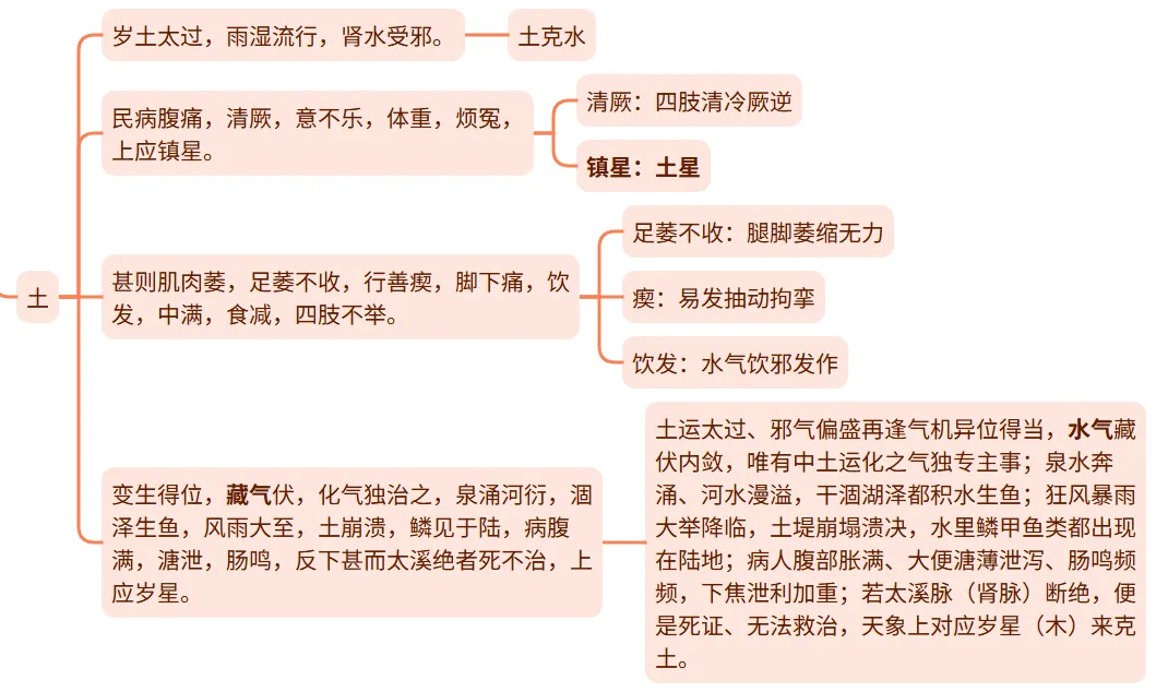 民病腹满身重,濡泄,寒疡流水,腰股痛发,腘、腨、股、膝不便,烦冤,足痿,清厥,脚下痛,甚则跗肿,藏气不政,肾气不衡,上应(镇星)辰星,其谷秬。