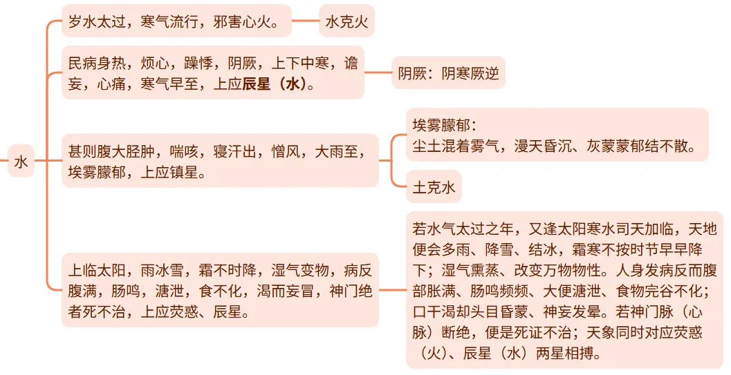 上临太阴,则大寒数举,蛰虫早藏,地积坚冰,阳光不治,民病寒疾于下,甚则腹满浮肿,上应镇星(荧惑),其主黅谷。