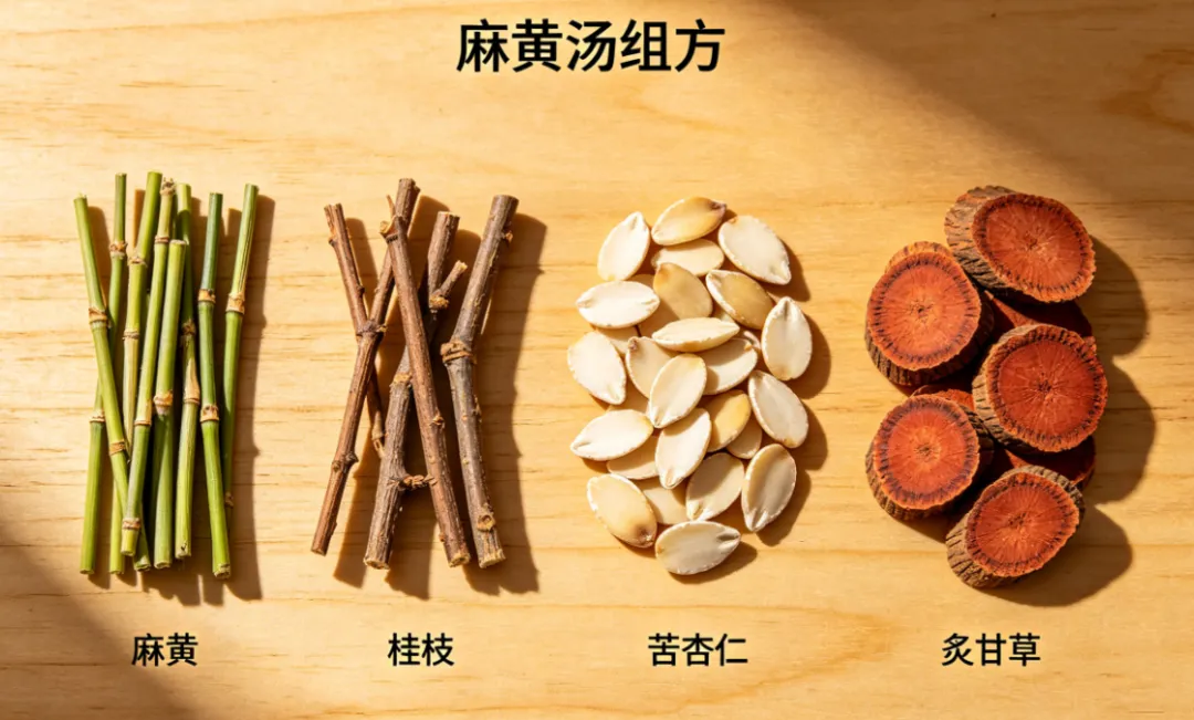 汤方组成:麻黄(三两,去节)、桂枝(二两,去皮)、甘草(一两,炙)、杏仁(七十个,去皮尖)。