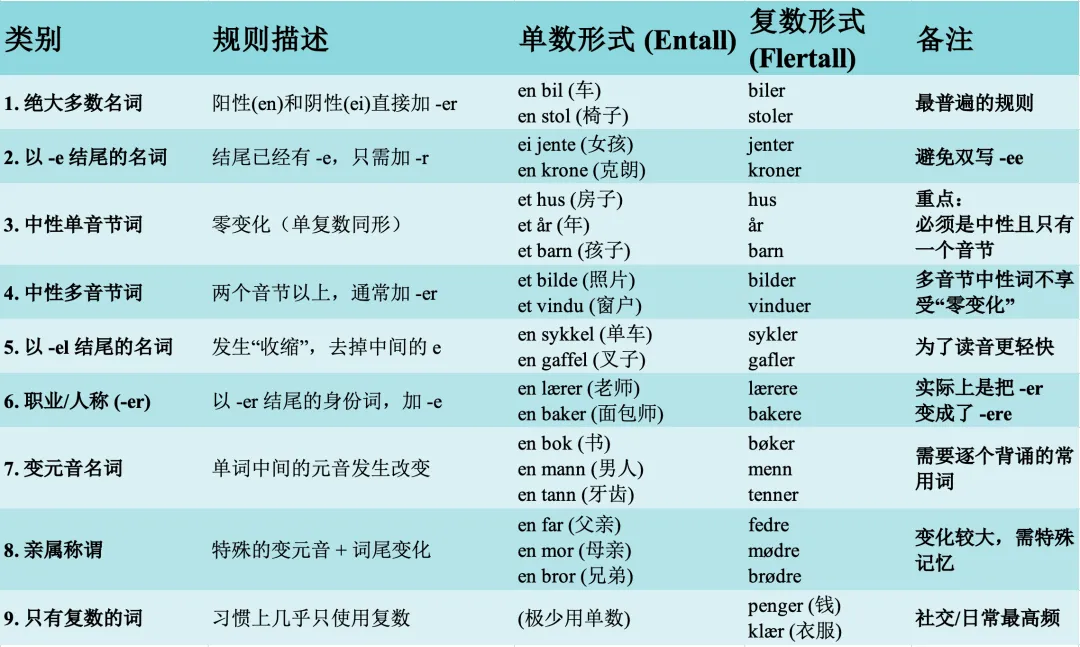 有些词在挪威语中几乎总是以复数形式出现,建议直接记复数: