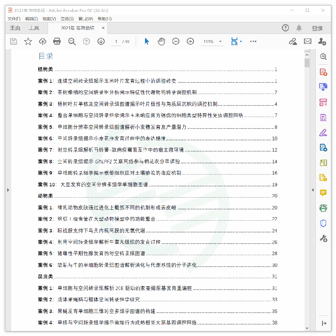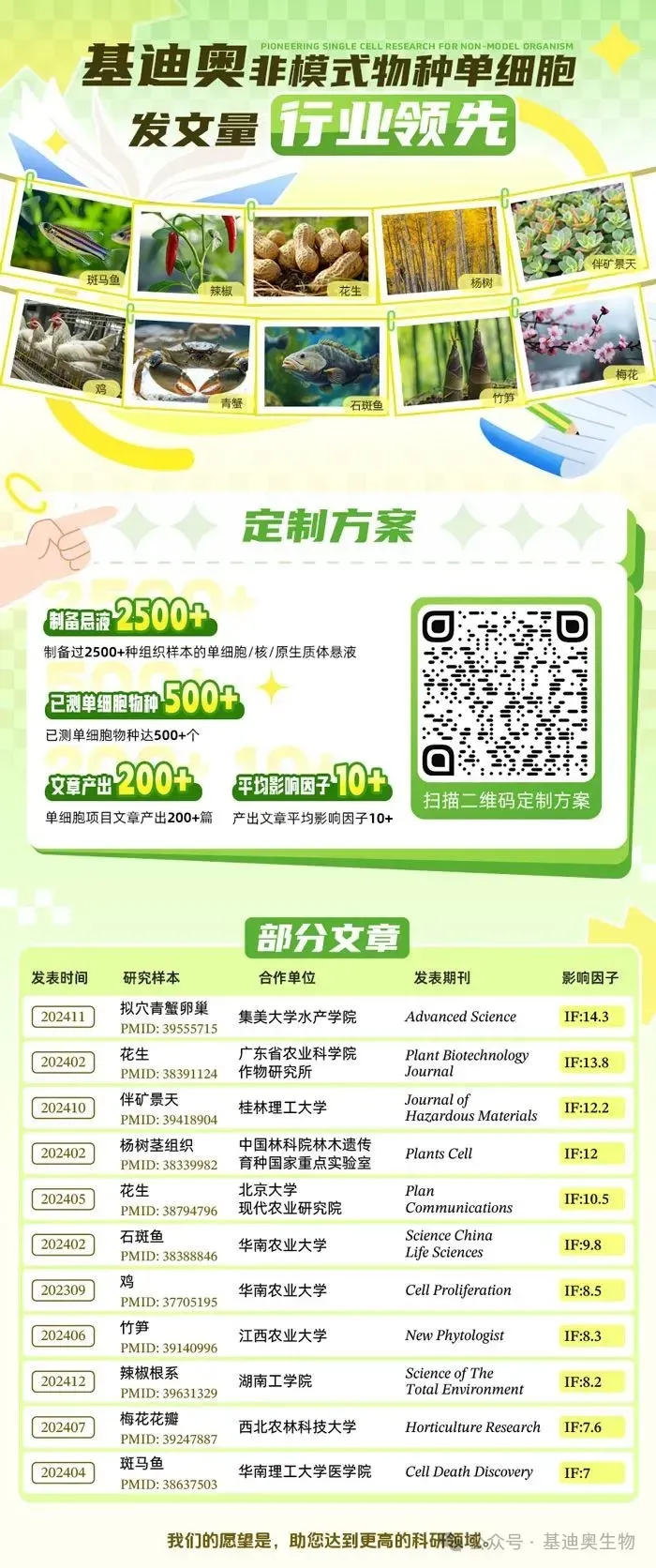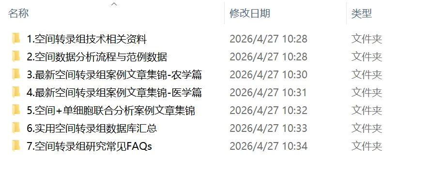 随着时间发展,空间转录组技术已和单细胞转录组技术一样,已成为生命科学研究中的重要手段!在基迪奥生物的公众号,你可能经常刷到其他团队发表高分文章而羡慕不已:那么,如何将空间转录组技术应用到自己的研究中并发表高分文章?基迪奥团队在空间组学领域目前已积累150+ 物种、420+ 组织、5000+切片的制备经验,辅助客户发表的高分文章更是不断!基于基迪奥团队累积多年的项目经验,我们为大家精心整理了一份详尽的空间转录组学习资料,免费送给大家!资料包的文件夹1包含基迪奥空间转录组学整体研究方案、Stereo-seq空间多组学技术成像指南和10X Visium用户指南,希望对你了解空间转录组技术有帮助!文件夹2为空间转录组数据分析实操教程,主要包括标准分析流程和常见图表(如t-SNE散点图、UMAP散点图、气泡图、热图等)的绘图教程。另外,文件夹中含示例数据和代码,为了方便大家看得懂代码,资料包中的R脚本带有详细的中文注释!对于资料包的文件夹3、4、5,则分别包含了最新的20篇农学空间转录组案例文章、22篇医学单细胞案例文章和10篇“空间+单细胞”联合分析案例文章。例如,农学空间转录组案例文章主要分为植物、动物和昆虫三大类,如下图。相信这些案例文章能为大家在实验方案设计、数据分析与可视化、文章投稿等方面提供参考!文件夹6则汇总整理了5个实用空间转录数据库的使用教程,大家可根据这些数据库的相应介绍,挑选感兴趣的进行使用,无需在网上苦苦寻觅!最后,我们还收集汇总了空间转录组实验设计和数据分析过程中大家常见的四大类问题,如Spot之间是否会发生交叉污染、组织透化的最佳时间点如何确定、冷冻包埋方法如何选择等,希望对你有帮助!资料包领取方式很简单,关注基迪奥生物微信公众号,扫描下方二维码填写空间(或单细胞)转录组测序意向信息即可(不要乱填哦)!之后会有工作人员联系您,在确认意向真实后会将资料包发送给您!最后,如果觉得这份空间转录组资料包还不错的话,欢迎转发到朋友圈!基迪奥生物不仅提供转录、翻译、蛋白、代谢、表观、微生物等常规组学服务,还拥有空间组学和单细胞等多种前沿技术,以及行业内最专业的开发团队和长达十几年的成果积累,始终专注于组学测序和生信分析,为不同领域研究人员提供最优的组学研究策略。欢迎有项目意向的老师扫描下方二维码填写信息,基迪奥为您定制个性化项目执行方案。