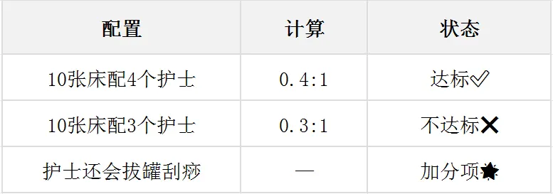 现实是:有些医院的中医科病房,护士配置是这样的:白班2个护士,夜班1个护士,总共3个护士,结果床位有15张——比例只有0.2:1,不达标。