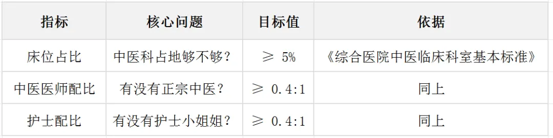 举个例子:如果全院1000张床位,中医科至少要有50张。要是只有30张,对不起,这个指标就像口袋里的手机——没“达标”。