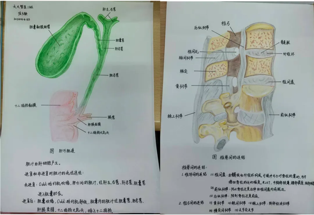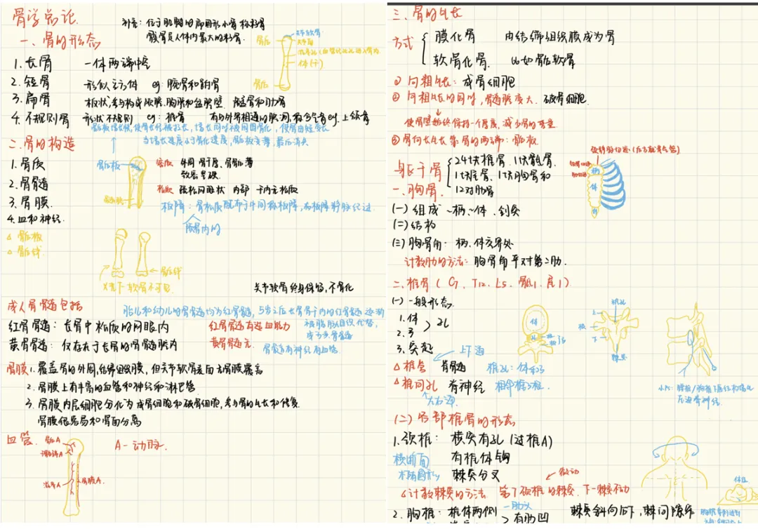 对我来说,解剖笔记最好的辅助方式就是边画边记。很多结构的位置、毗邻,光靠文字很难想象,我会在整理笔记时画一些简单的示意图,比如画一个椎体的结构、一段血管的分支,或者一条神经的传导通路,哪怕线条不工整,也能帮我把抽象的文字转化成具象的画面。画完之后再对照教材标注结构名称,这个过程本身就是一次深度的记忆,后续复习看到自己画的图,就能快速想起相关的知识点,比硬背文字高效很多。