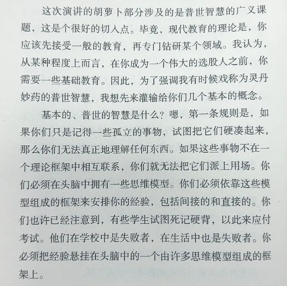)许多——可惜还是不够——教育机构已经意识到这一点。在哈佛商学院,所有一年级学生都必须学习的定量分析方法是他们所谓的“决策树理论”。他们所做的只是把高中代数拿过来,用它来解决现实生活中的问题。那些学生很喜欢这门课程,他们为高中代数能够在生活中发挥作用而感到惊奇。你们必须掌握这种非常基础的数学知识,并在生活中经常使用它——就好比你们想成为高尔夫球员,你们不能使用长期的进化赋予你的挥杆方式。你们必须掌握一种不同的抓杆和挥杆方法,这样才能把你打高尔夫的潜力全部发挥出来。如果你没有把这个基本的但有些不那么自然的基础数学概率方法变成你生活的一部分,那么在漫长的人生中,你们将会像一个踢屁股比赛中的独腿人。这等于将巨大的优势拱手送给了他人,这么多年来,我一直跟巴菲特共事;他拥有许多优势,其中之一就是他能够自动地根据决策树理论和基本的排列组合原理来思考问题。显然,你们也应该掌握会计学。会计是从事商业活动的语言,它是对人类文明的一大贡献。我听说它是威尼斯人发明的,当然啦,威尼斯曾经是地中海地区商业最发达的城市。总之,复式薄记真是一种了不起的发明。而且它也并不难理解。但你必须对会计有足够的理解,才能明白它的局限——因为会计虽然是(商业活动的)出发点,但它只是一种粗略的估算。要明白它的局限不是很难。(掌握会计学原理会帮助我们看懂财务报表,洞悉财务造假的具体操控手段,远离那些不诚信的企业。毕竟,财报是用来排雷的。)为了说明会计的局限,我常常举一个跟卡尔·布劳恩有关的例子。布劳恩是一个非常伟大的商人,他创建了C.E.布劳恩工程公司.该公司设计和建造炼油厂——那是很难的事情。而布劳恩能够准时造好炼油厂,让它们顺利而高效地投产。这可是一门了不起的艺术。布劳恩是个地道的德国人,他有许多趣闻轶事。据说他曾经看了一眼炼油厂的标准会计报表,然后说:“这是狗屁。”于是他把所有会计都赶走了,召集手下的工程师,对他们说:“我们自己来为我们的商业流程设计一个会计系统吧。”他的经历体现了会计的重要性,以及懂得标准会计局限性的重要性。他还有个规矩,他要求布劳恩公司所有的交流必须遵守“五何”原则——你必须说明何人因何故在何时何地做了何事。如果你在布劳恩公司里面写一封信或指示某人去做某事,但没有告诉他原因,那么你可能会被解雇。实际上,你只要犯两次这种错误,就会被解雇。你们也许会问,这有那么重要吗?嗯,这也跟心理学的原理有关。如果你能够将一堆模式的知识组合起来,回答一个又一个为什么,你就能够更好地思考;同样道理,如果你告诉人们事情的时候,总是告诉他们原因,他们就能更深刻地理解你说的话,就会更加重视你说的话,也会更倾向于听从你说的话。就算他们不理解你的理由,他们也会更倾向于听你的话。正如你想要从问一个又一个的“为什么”开始获得普世的智慧一样,你在跟别人交流沟通时,也应该把原因讲清楚。就算答案很浅显,你把“为什么”讲清楚仍是一种明智的做法。(打破砂锅问到底的习惯很重要,它会促使你进行深度思考。在面对政府部门推出的各种政策法规,社会上发生的各种事情以及我们身边出现的各种现象时,我们需要不停地追问自己三个字“为什么”,理清背后的底层逻辑。尽管有时候你会很失落很痛苦,觉得这个世界真TMD操蛋,但你会保持清醒,会懂得镰刀收割韭菜的手段,原谅我不能多说,感谢大家。)片尾彩蛋