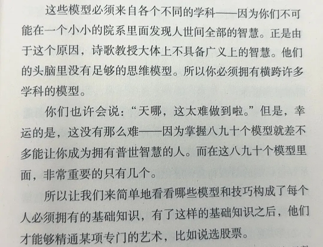。今天,我想对你们的学习课题做点小小的变动一今天的主题是选股艺术,它是普世智慧艺术的一个小分支。这让我可以从普世智慧谈起——我感兴趣的是更为广泛的普世智慧,因为我觉得现代的教育系统很少传授这种智慧,就算有传授,效果也不是很明显。(如果连美国都很少传授的话,咱们这就更不用说了。至于为什么,看看想要子女接受更好教育的高净值群体是怎么做的就知道了,很多让子女在高中阶段就去美国求学了,完全不用在国内内卷高考。你可以质问有钱人的人品,但请不要怀疑他们的眼光。)所以呢,这次演讲展开的方式将会有点像心理学家所说的“祖母的规矩“——这个规矩来自祖母的智慧,她说你们必须先吃完胡萝卜,然后才准吃甜点。思维模型是什么呢?这么说吧,第一条规则是,你必须拥有多元思维模型——因为如果你只能使用一两个,研究人性的心理学表明,你将会扭曲现实,直到它符合你的思维模型,或者至少到你认为它符合你的模型为止。你将会和一个脊椎按摩师一样——这种医师对现代医学当然是毫无所知的,那就像谚语所说的:“在手里拿着铁锤的人看来,每个问题都像钉子。”当然,脊椎按摩师也是这样治病的,但这绝对是一种灾难性的思考方式,也绝对是一种灾难性的处世方式。所以你必须拥有多元思维模型。首先要掌握的是数学。很明显,你必须能够处理数字和数量问题,也就是基本的数学问题。除了复利原理(爱因斯坦称复利是世界第八大奇迹)之外,一个非常有用的思维模型是基本的排列组合原理。这是非常简单的数学知识。(额,简单?这点至少笨头笨脑的我不认可,高中时做的排列组合题目真够我喝一壶的