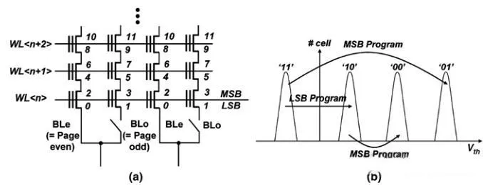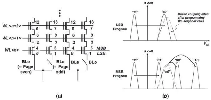 最基本的方法是顺序写入各个Page,从低WL到高WL,先BLe再BLo,先LSB到MSB。下图的数字标识了Page/Cell的写入次序。Cell的状态,LSB写入从最低的擦除态“11”转移到“10”,之后MSB写入再依次转移到“00”和“01”。