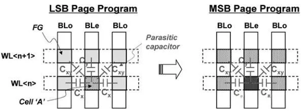 相邻的Page之间,会通过FG耦合相互影响,导致原本写入完成后很窄的Vt分布,在下一页写入操作时变宽。特别是Cell微缩后,FG间寄生电容变大,耦合增强,影响越发严重,成为影响MLC的最主要因素。