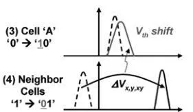 最差情况,LSB阶段,受害Cell A状态从“0”到“1”,相邻Cell保持擦除状态。在MSB阶段,受害Cell A写入"10",即保持Vt不变,但相邻Cell都写入“01”到最高Vt。如下图,受害Cell的Vt会发生很大的偏移。