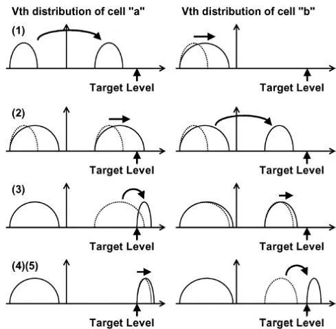下图直观表现了,两个邻近Cell a和b,在该写入方案过程中Vt分布的变化。Cell耦合的近似表达放在文末的表里。顺带提下,此方案为每页Page增加了一个标识flag cell,在MSB阶段也会写入,用来在读取时区分LSB/MSB。