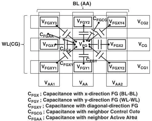 控制(Qfg=0),即:V_{FG}=\frac{C_{IPD}}{C_{TUN}+C_{IPD}}V_{CG}=CR*V_{CG}随着NAND cell微缩,周围的寄生电容越来越大,不可忽略。FG电容耦合现象发生后,FG的电势不仅由CG决定,还与周围的耦合FG电势相关。