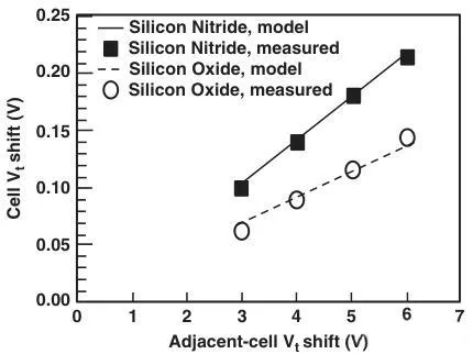 \Delta V_{FG}=\frac{C_{FGY}}{C_{total}}*\Delta V_{FGY2}根据0.12um Cell的模拟计算结果,Cell Vt从-3V写入到2.2V,y方向影响0.19V,x方向影响0.04V,对角方向影响0.01V。FG耦合干扰的作用基本呈线性。且随着NAND微缩而急剧增大。