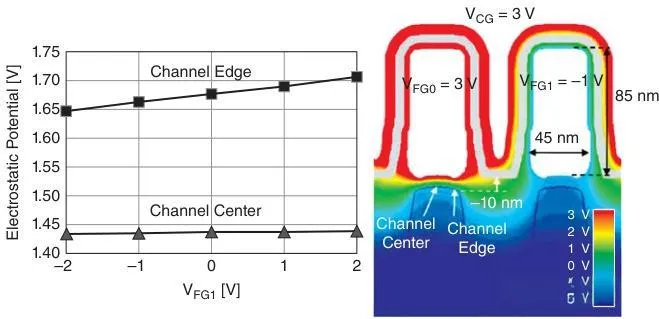 \Delta V_X 超过 ΔVY\Delta V_Y ,特别是在20nm结点显著增大。原因是到此结点以后,Cell晶体管的沟道边缘与相邻FG的距离很短,相邻FG的电场直接作用于沟道。其次,约70%的电流流经沟道边缘,放大了沟道直接耦合的干扰。因此,x方向的干扰叠加上直接沟道耦合:\Delta V_X=2*(C_{FGX}/C_{total})*\Delta V_{FGX}+\alpha*C_{FGX-STI}*\Delta V_{FGX}下图是电磁仿真的结果,注意到沟道边缘受相邻FG1影响,在V_FG1=2V时,为1.65V,当V_FG1=-2V时,沟道边缘电势变成1.71V。与此同时,Cell Vt的变化量更大,从0.62V增大到0.82V,原因是沟道边缘的硼偏析更严重。实际上,由于电容耦合系数约0.5,Cell Vt的变化能达到2倍。这个结果表明,直接沟道耦合的影响大于FG之间的电容耦合。