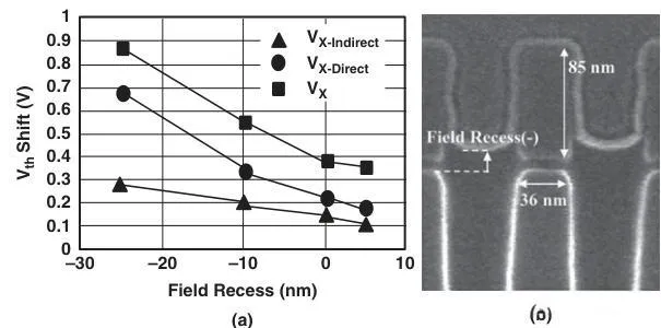 一个控制直接沟道耦合的变量是Field Recess场区凹槽的深度。凹槽越浅,则直接沟道耦合越严重。因此,在50nm结点以下,需要将场区凹槽尽量刻深,但同时避免过度刻蚀导致Vt负移问题,需要在其中找到平衡。