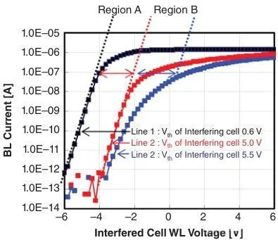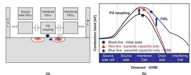 在40nm结点,报道了一种新的耦合机制,浮栅诱导势垒增强Floating-gate induced barrier enhancement(FIBE)。从y方向的受干扰Cell Vt与施加干扰Cell Vt之间的关系,我们可以分出两段。施加干扰较低<5V时,受害Cell的Vt线性增长,符合通常FG电容耦合。一旦超过5V,受害Cell Vt迅速增大。这一部分异常增大,就来自FIBE,出现在WL与WL之间。