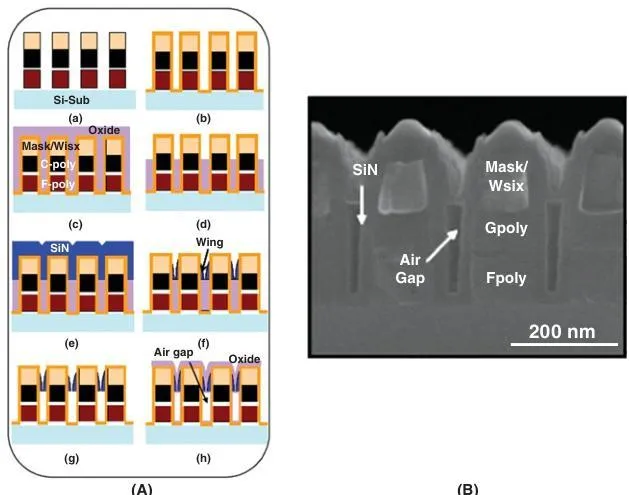 形成AG的流程如下。在Gate刻蚀出来后,沉积一层缓存氧化层/氮化层,接着在Gate之间填充占位氧化硅,Poly上方的氧化硅干刻去掉。之后在Gate之间用氮化硅沉积-刻蚀,形成翼Wing。把之前的氧化硅去掉,成为空气间隙。最后沉积氧化层封闭空气间隙,参考SEM切片。
