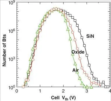 我们对比Gate间不同填充材料的FG耦合干扰。显然,Air Gap优于氧化硅优于氮化硅,源于更小的FG寄生电容,Vt偏移量SiN:Oxide:Air=8:4:1。