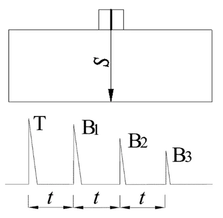 厚度计算:计算电路计算第一次底面反射回波 B1 与第二次底面反射回波 B2 的时间间隔,利用已知声速和时间计算出声程,即工件厚度。计算公式中时间 t 取单程。