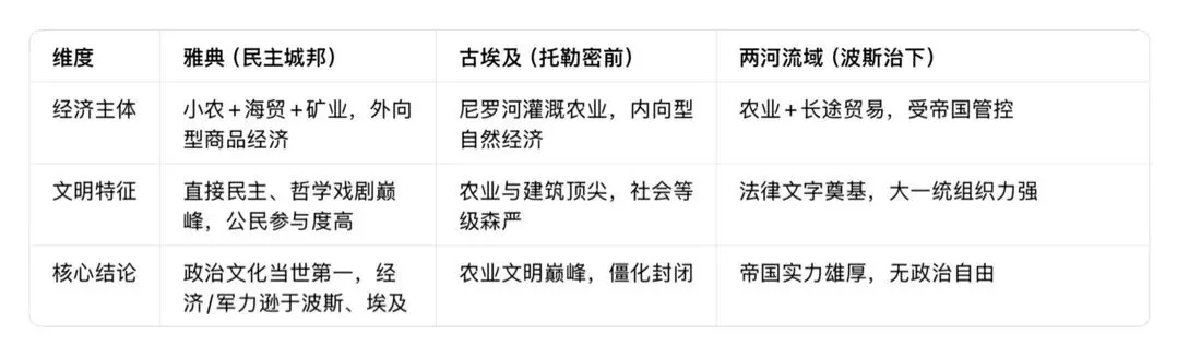 ◦ 地理:阿提卡多山少平原,倒逼小国寡民与海洋贸易,划定直接民主参与上限。
