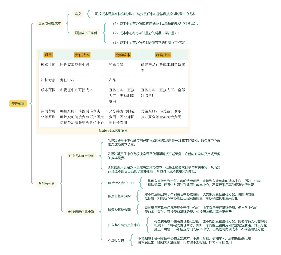 搞懂这3点,业绩评价不丢分! 朋友们早上好,这里是财会人的小酒馆。昨天凌晨六点的闹钟响了,爬起来背战略,忽然想起当年学《财管》第十九章“责任会计”时的崩溃——那个“责任成本”和“制造成本”、“变动成本”绕来绕去,做题永远分不清谁是谁。考场上,一个多选题可能就让你痛失宝贵的1.5分。今天,咱们就用15分钟,把“责任成本”这个“老演员”彻底扒清楚。核心就三点:它是什么?和别的成本有啥不同?在实务中怎么判断和分摊? 搞定它,业绩评价的分数基本就稳了。一、灵魂拷问:责任成本到底是什么?(理论) 说人话:责任成本就是“谁的孩子谁抱走”。它不是算某个产品花了多少钱,而是算某个部门或个人(责任中心)该为多少成本负责。它的核心在于“可控”二字。可控成本必须同时满足三个条件(口诀:可预见、可计量、可控制): 可预见:你知道会发生什么性质的耗费。 可计量:你能算得清这笔耗费是多少钱。 可控制:你能管得住这笔钱的支出。 三个关键注意(考场特爱挖坑): 注意1(看对象):一项成本,对A车间是可控的,对B车间可能就是不可控的。比如,A车间主任能决定自己用的机油品牌和数量,这机油费对他就是可控成本;但对只用不买的B车间,这就不可控。 注意2(看时间):成本在发生或支付的当下是可控的。钱一旦花出去,就成“沉没成本”,不可控了。比如,批准采购的当下是可控制的,但机器买回来开始计提折旧了,这折旧费对使用部门就不可控了。 注意3(看范围):跳出具体部门和时段,站在全公司、全生命周期看,所有成本都可控。但考试和实务中,我们只针对特定责任中心和特定时期来谈可控性。 真题锚定(改编自教材例题) 【多选题】下列属于判断成本是否可控的条件有( )。 A. 可计量性 B. 可追溯性 C. 可调控性 D. 可预测性 (答案及解析在文末)二、别再傻傻分不清!一张表看懂三种成本(图解) 这是本章最易混点,也是必考点。咱们直接上对比表,一表搞定:比较项目 | 责任成本 | 变动成本 | 制造成本 |