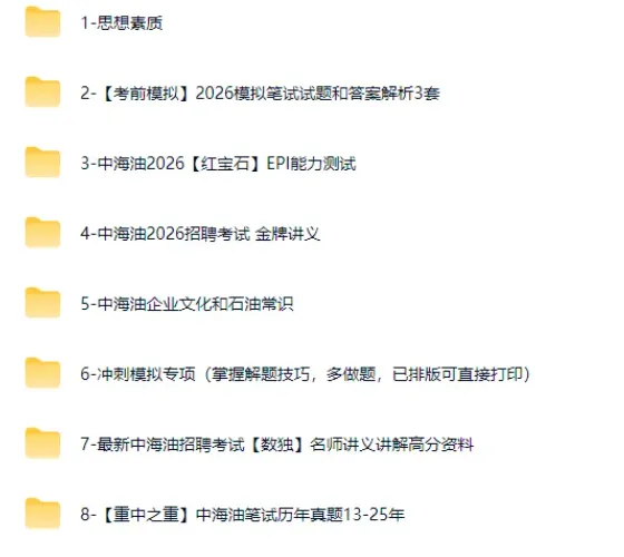 【中海油备考】2026中海油学习备考资料(笔试真题+企业文化+常识+测评等) | https://pan.baidu.com/s/1u-UWkQmLx7ppzNQz7j4Lyg?pwd=y31e 提取码: y31e |