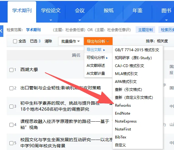 2.数据下载与保存:知网勾选文献后,点击“导出与分析”—“导出文献”—“Refworks”—跳转新页面“导出”—“另存为”—保存到刚设定的文件夹“input”里—同时,命名为“download_XXX.txt”