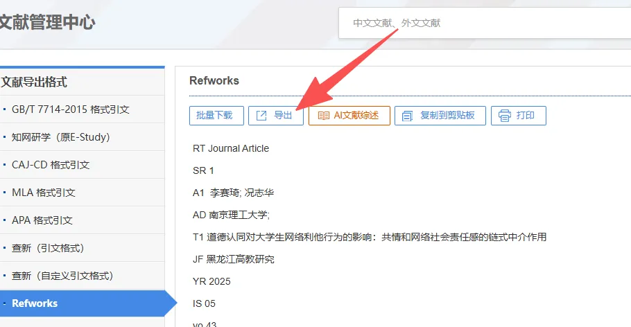 确保文献包含作者、标题、出版物来源、摘要、出版年、文献类型、关键词等。如图所示
