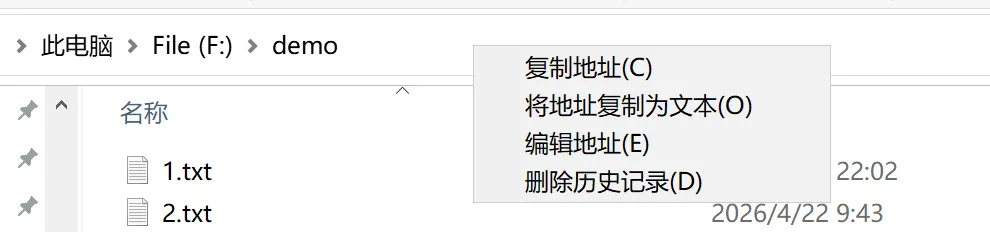 3.复制文件夹地址:我的文件夹放在F盘了,因而先复制文件夹的路径——“复制地址”。