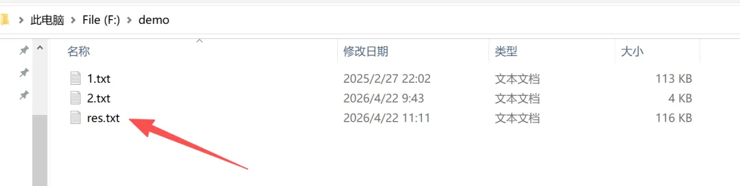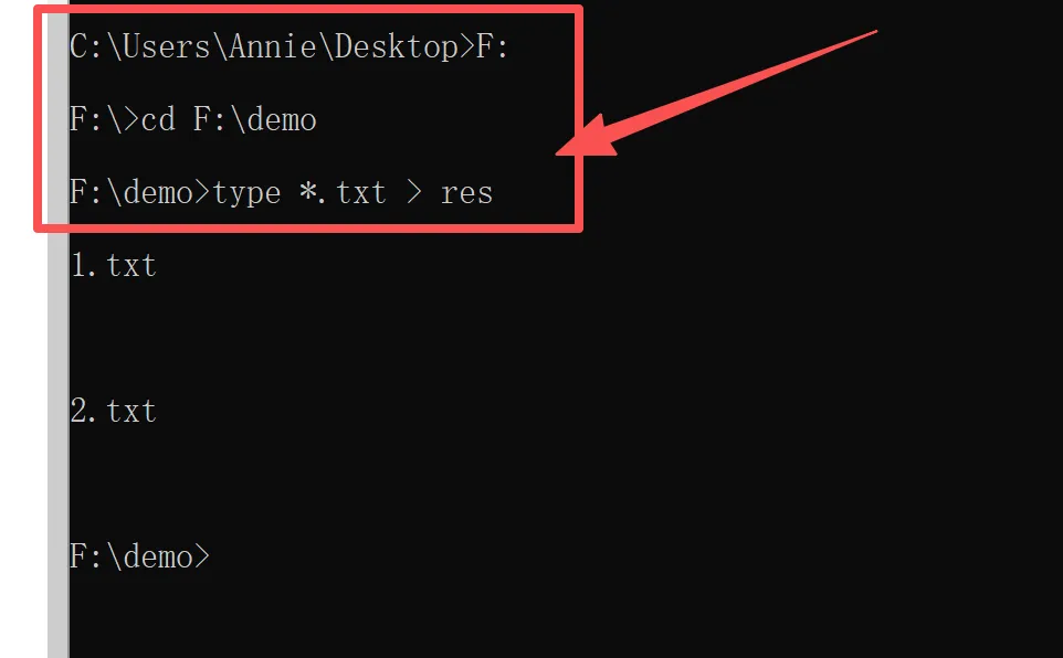 C:\Users\Annie\Desktop>F: //后接回车键F:\>cd F:\demo //F:\demo为路径地址,回车键结尾F:\demo>type *.txt > res //输入:type *.txt > res