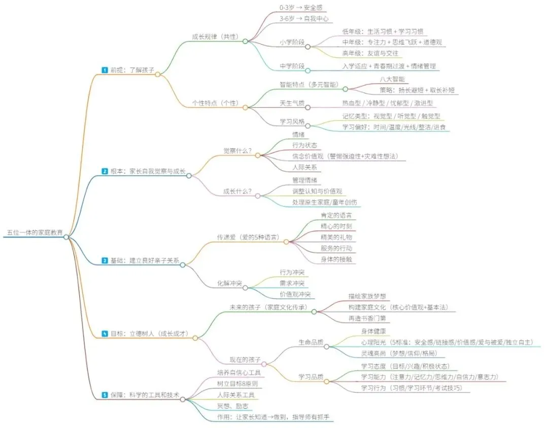 今天又认真地听了一遍“五位一体的家庭教育”体系。这真的是孙老师十几年心血的结晶,讲起来娓娓道来,听起来觉得包罗万象。这要有多大的知识量积累,才能整合为这样一个简洁明了的知识体系?确实把家庭教育的方方面面讲透了:从前提到根本,再到关系作为基础,再到最后目标的设立,以及作为保障的工具技术。