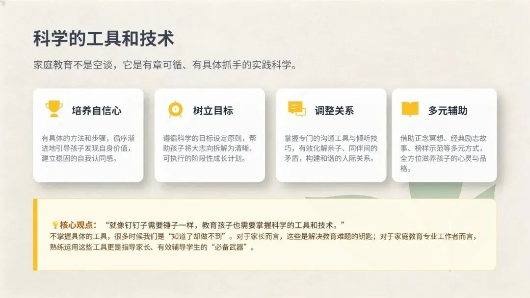 确实如此。方法也是从实践当中得来的,这需要家长不断地自我学习和提升。前面也提到,这可能是一辈子的事情。