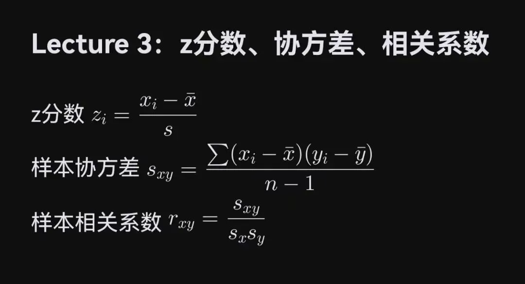 最后说两个变量有没有关系。协方差如果是正数,说明它们同向变化;如果是负数,说明反向变化;接近零说明没有线性关系。相关系数被压缩在负一到正一之间,绝对值越接近一,关系越铁。这个数真的很好用。