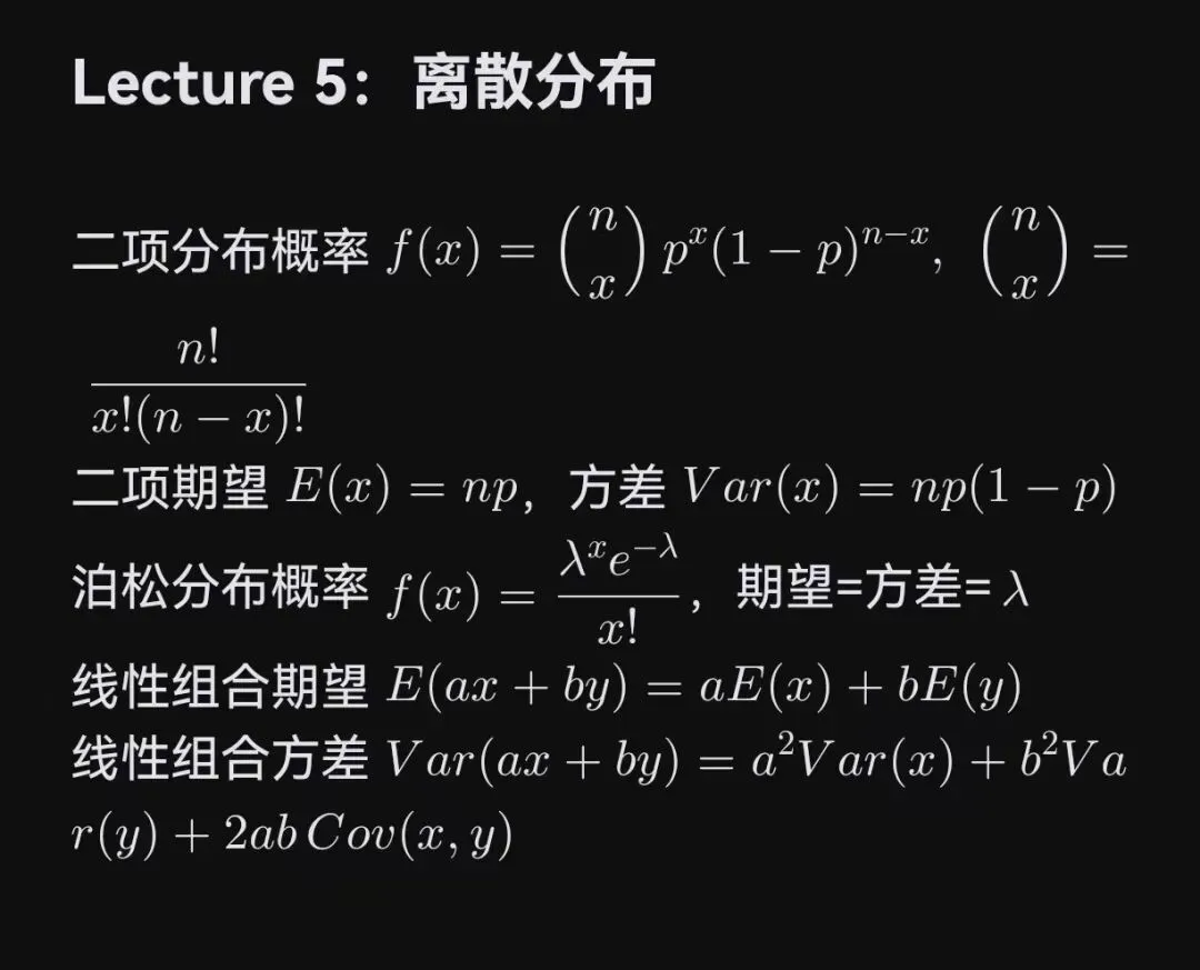 泊松分布也很常见。它适用的场景是在单位时间或单位空间内,随机事件发生几次,比如一小时内平均来两个顾客。泊松分布的期望等于λ,方差也等于λ。这个性质很特别。