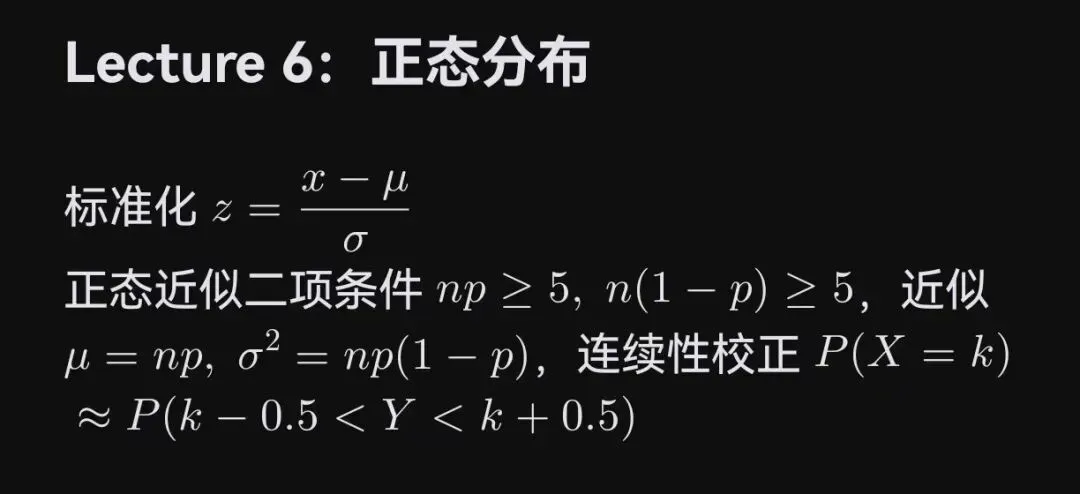 我们还可以用正态分布去近似二项分布。条件是n乘以p和n乘以一减p都大于等于五。注意要用连续性校正,比如把P(X等于12)近似成P(11.5小于X小于12.5)。这个小技巧很贴心。