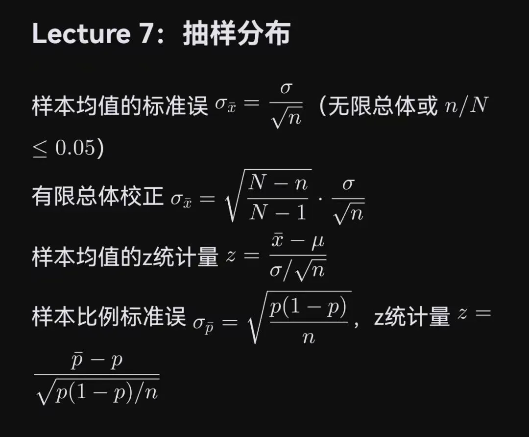 样本均值的抽样分布尤其重要。它的期望等于总体均值μ。它的标准误等于总体标准差除以根号n。中心极限定理告诉我们,只要样本量n大于等于三十,样本均值的分布就近似正态,不管你原来的总体长什么样。这个定理真的太强大了。