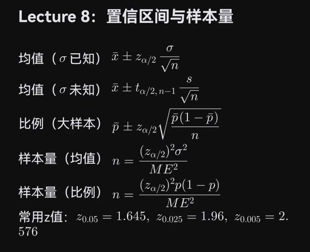 数据,然后描述统计,包括均值、方差、图表。然后概率与随机变量,包括二项分布、泊松分布、正态分布。然后抽样分布与中心极限定理。最后置信区间,也就是用样本估计总体。