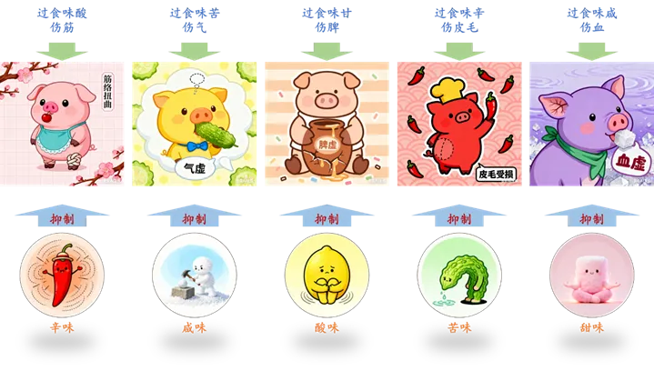 酸伤筋,辛胜酸……苦伤气,咸胜苦……甘伤肉,酸胜甘……辛伤皮毛,苦胜辛……咸伤血,甘胜咸…——《素问·阴阳应象大论》