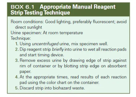尽管试剂条易于使用,但正确的操作技术对于确保结果准确至关重要。BOX6.1总结了一种合适的手动试剂条检测技术。必须遵循试剂条和片剂测试随附的制造商说明,以获得准确结果。请注意,不同制造商的说明各不相同,且未在正确时间读取反应结果可能导致报告错误结果。例如,Multistix试剂条上的反应必须在指定的特定时间读取,时间从30秒到2分钟不等。相比之下,Chemstrip品牌试剂条上的所有反应均已稳定,可在2分钟时读取。