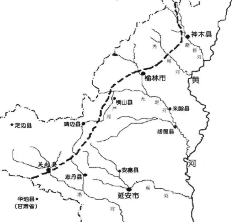 秦汉长城陕北段大致呈东北一西南走向‚ 由北向南依次经过神木 县市、榆阳区、横山区、靖边县、志丹县和吴起县。