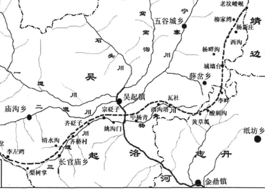 秦汉长城在吴起县长约90余公里‚经过5个乡镇‚ 30余个村庄,在志丹县长13约公里‚经过2个乡镇‚ 4个村庄。有东北向西南依次为五谷城镇的四河堡村赫家沟、四河堡村西沟、白草沟村杨家沟,原薛岔乡(现部分为五谷城镇)的杨新庄村赵家山、杨新庄村满泉河、杨新庄村柳家湾、杨新庄村林湾、杨新庄村西沟、双庙村老庄、双庙村石咀沟、雷坡村鸟弯、雷坡村周崾崄、薛岔村南沟、薛岔村大路沟、南沟村柳沟,郭畔村小木界、郭畔村贺阳湾、郭畔村李拜寺,志丹县的原纸坊乡(部分为顺宁镇)的李畔村和金鼎镇的卜鱼沟村黄草坬、卜鱼沟村酸刺沟、马莲崾崄村刘庄。再进入吴起镇的西沟塔村瓦社、西沟塔村阳台、西沟塔村西沟塔、杨青村、中杨青村、石碑湾村、壕湾村、姚沟门村、宗贬子村、蔺新庄村,长官庙镇的齐桥村高台、齐桥村阳庄、张沟门村、阳台村、阳台村阳洼、阳台村城墙、白沟村梨树掌和庙沟乡镇的曾岔村东涧、曾岔村营崾崄、曾岔村李左湾、曾岔村林沟梁。