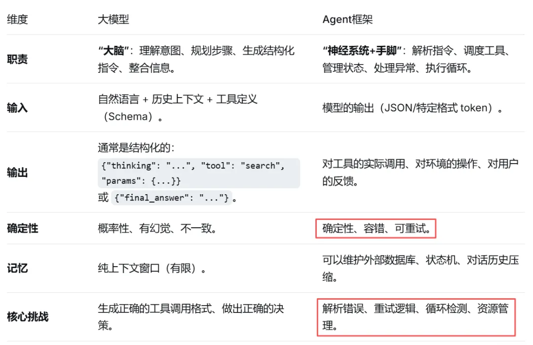 关键分界线:大模型负责“决定做什么”,Agent负责“如何做”以及“做完了怎么办”。