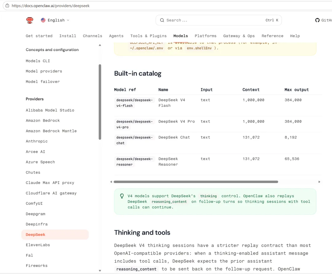 DeepSeek V4的核心技术包含了面向Agent能力的全栈优化,现在在Openclaw上也可以直接选择DeepSeek V4的模型了,Openclaw上的模型选择,国内的大模型已经很多了,阿里的千问、DeepSeek,GLM、Minimax、Moonshot的Kimi、百度的Qianfan、腾讯的Hy3、小米的Mimo,足见大模型厂商对Agent的重视程度。