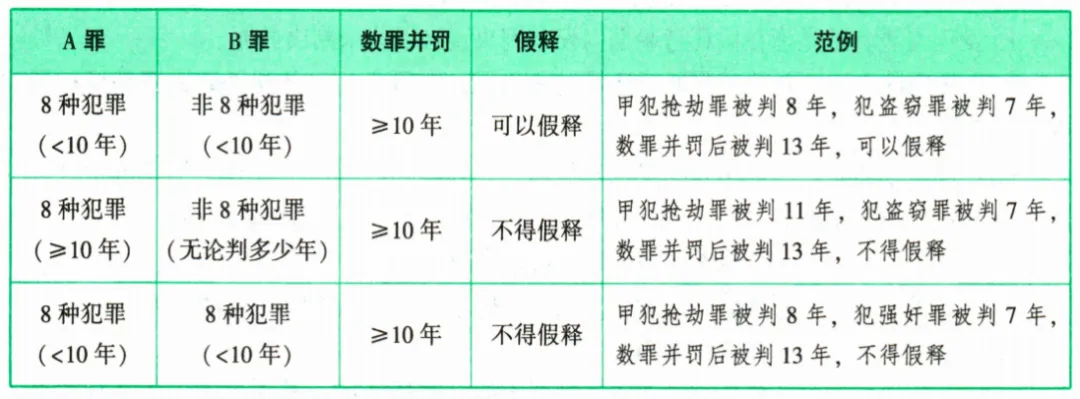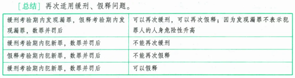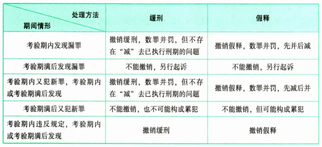 失败的假释:假释被撤销(已经经过的考验期,不算已经执行的刑期)三种情形以及处理方式:1.发现漏罪。这是指在假释考验期内发现判决宣告以前未判决的罪。(1)发现的漏罪,是故意犯罪、过失犯罪,以及是否是同种罪都在所不问。(2)撤销假释后,对前罪和漏罪先并后减,也即,将前罪刑期和漏罪刑期进行合并,然后减去前罪已执行刑期。(4)如果在考验期期满后发现漏罪,就不能撤销假释,只能另行起诉审判。(1)又犯的新罪,是故意犯罪、过失犯罪,以及是否是同种罪都在所不问。(2)在考验期内犯新罪,无论是否在考验期内发现,都要撤销假释。(3)撤销假释后,对前罪和新罪先减后并,也即,先用原判刑期减去已执行刑期,然后用剩余刑期跟新罪刑期合并。【提示】如果在缓刑考验期内犯新罪,撤销缓刑,数罪并罚后,有可能适用假释。(5)在考验期满后犯新罪(不能撤销假释),可以成立累犯,因为假释考验期满就视为刑罚已经执行完毕。3.在假释考验期内,违反法律、法规或者监管规定,应当撤销假释,收监执行尚未执行完毕的刑罚。四、缓刑和假释的比较