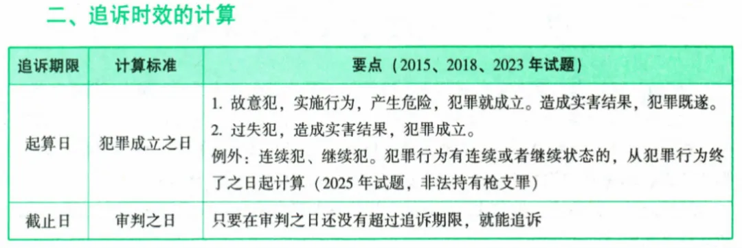 刑罚的消灭,是指由于法定的或事实的原因,致使国家对犯罪人的刑罚权归于消灭。刑罚消灭必须基于一定的事由。考试最常考的刑罚消灭事由是追诉时效。追诉时效,是指刑法规定的,对犯罪人进行刑事追究的有效期限,超过此期限,司法机关就不能追诉。一、追诉时效的期限