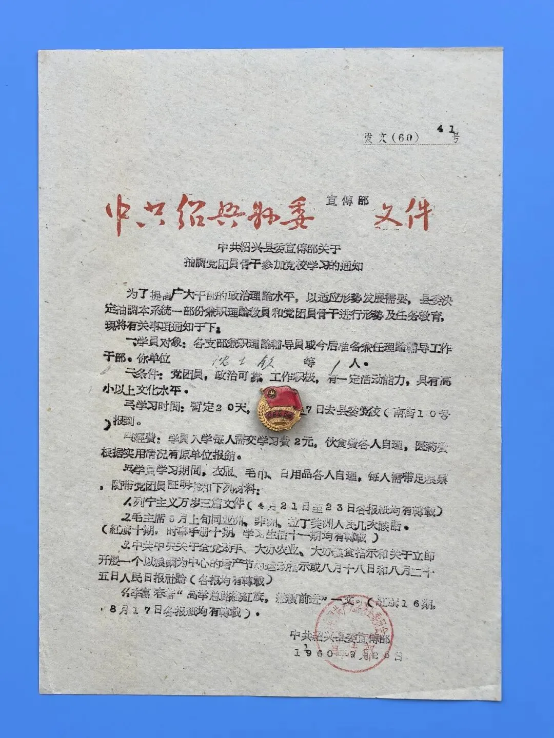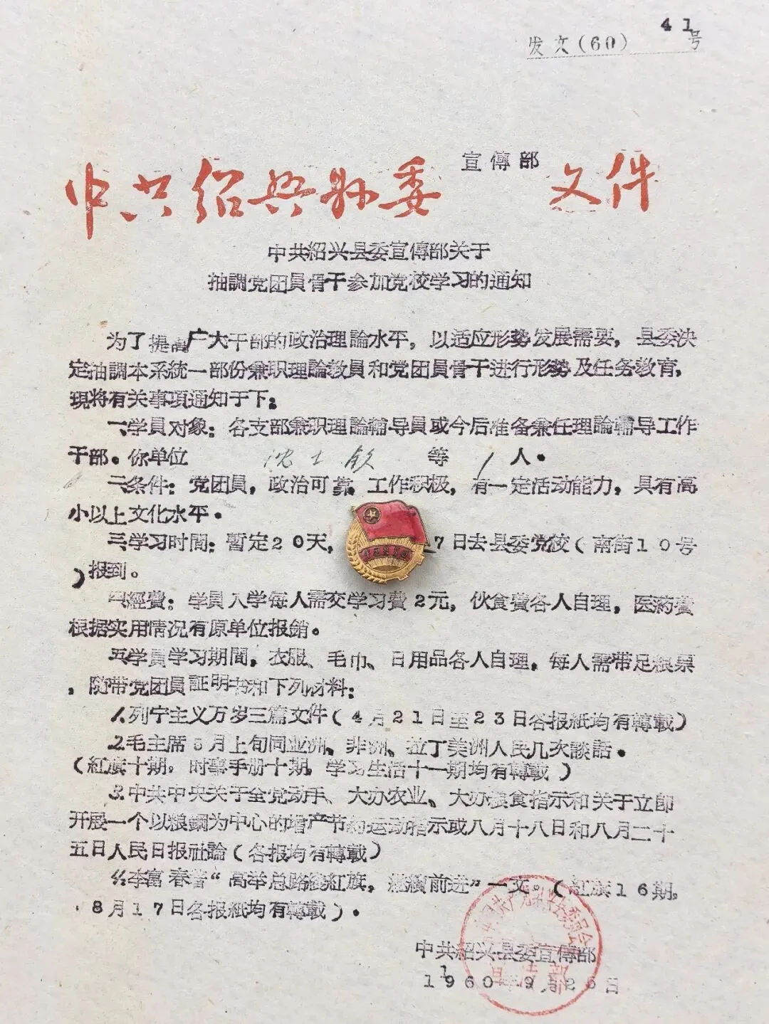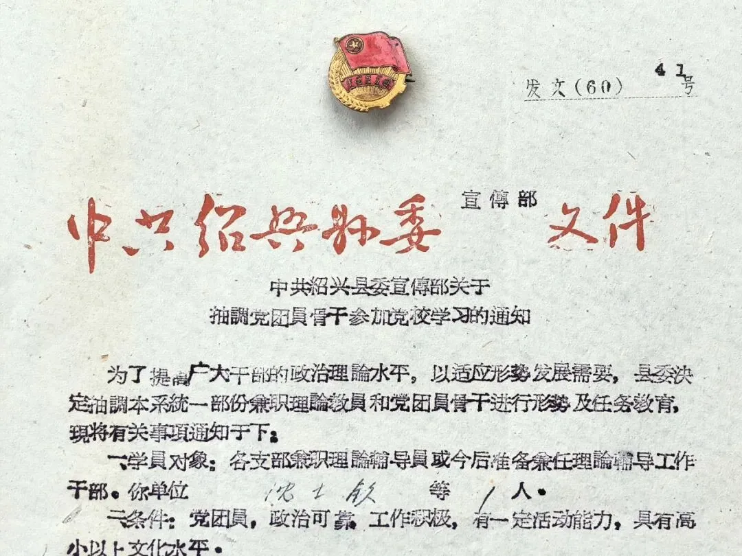 “为了提高广大干部的政治理论水平,以适应形势发展需要”,1960年9月26日,中共绍兴县委宣传部发出《关于抽调党团员骨干参加党校学习的通知》,文号为“发文(60)41号”,绍兴县委决定抽调本系统一部分兼职理论教员和党团员骨干,进行形势及任务教育。