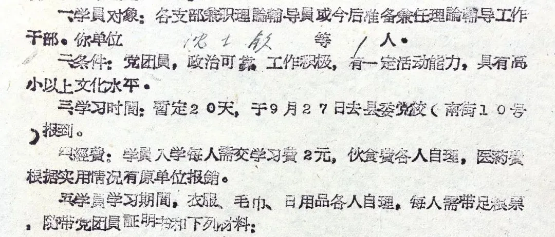 一是学员对象:包括各支部兼职理论辅导员,或今后准备兼任理论辅导工作的干部。该通知所填写的参加学习分配名额为1人,是沈士钦同志,他的具体身份信息不详,能被县委宣传部点名参加学习,肯定是理论水平较高、笔杆子过硬之人,大概率或是机关干部,或是学校教师。